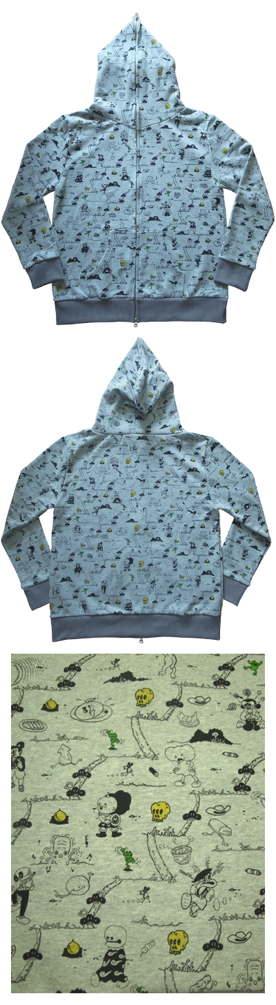 茂の描く独特な雰囲気を全面にプリントしました。又、このアイテムの真の主人公として、色々な場面に密かに登場する、ガリガリのネコと陽気なカエルをカラーで散りばめました。